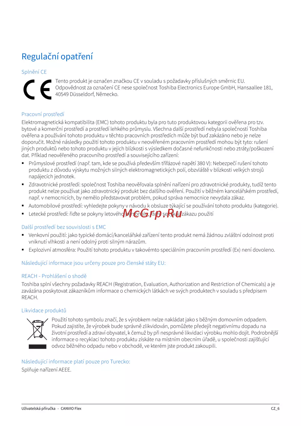 Odpovědnost za označení CE nese společnost Toshiba Electronics Europe GmbH, Hansaallee 181,