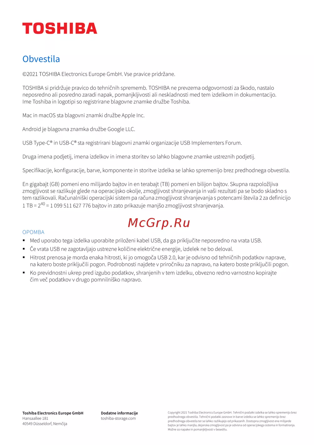 opyright 2021 Toshiba Electronics Europe GmbH. Tehnični podatki izdelka se lahko spremenijo brez