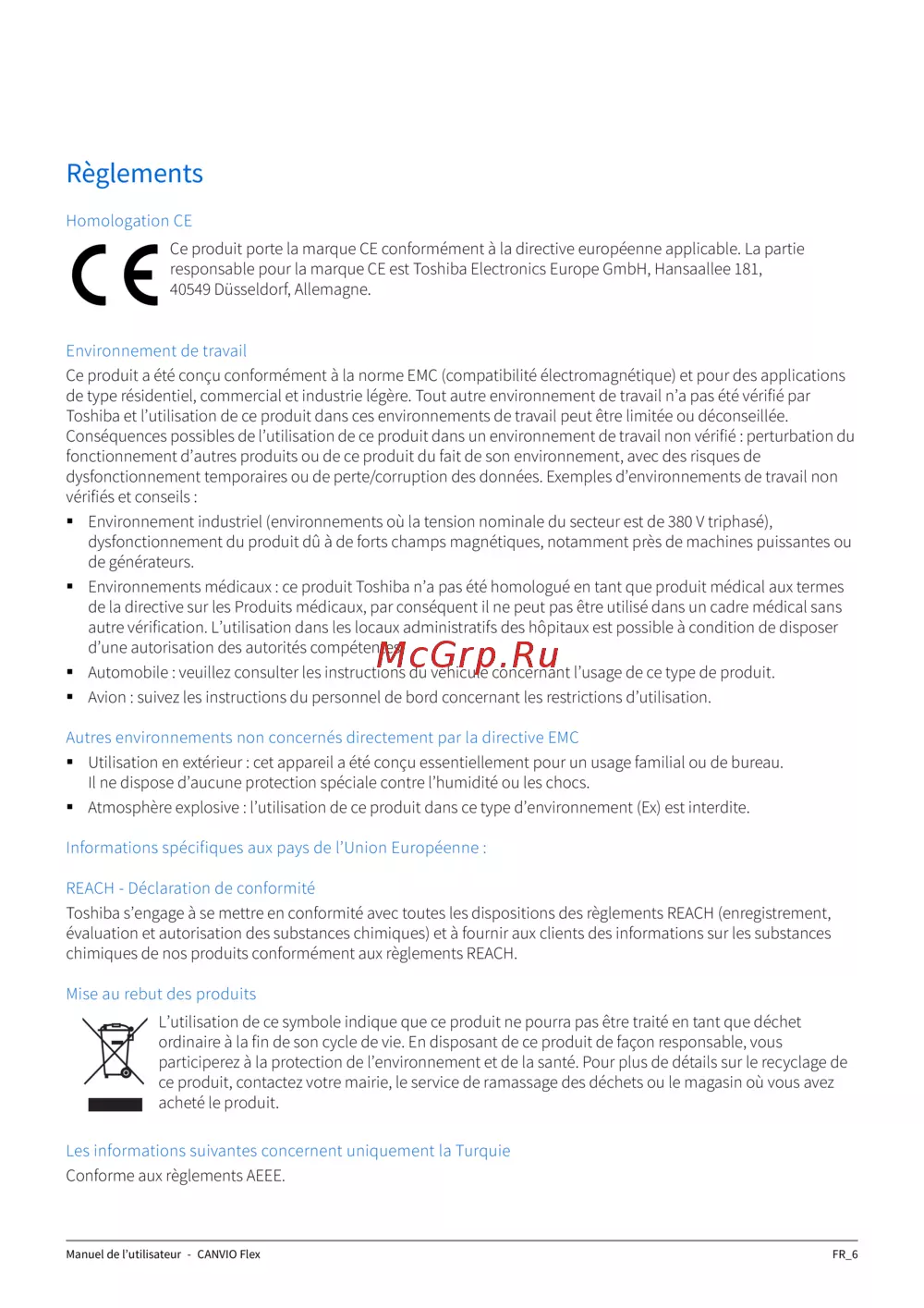 responsable pour la marque CE est Toshiba Electronics Europe GmbH, Hansaallee 181,