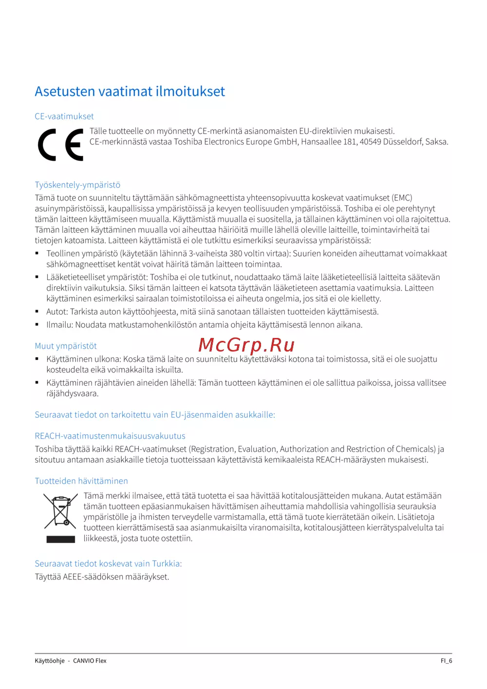 CE-merkinnästä vastaa Toshiba Electronics Europe GmbH, Hansaallee 181, 40549 Düsseldorf, Saksa.