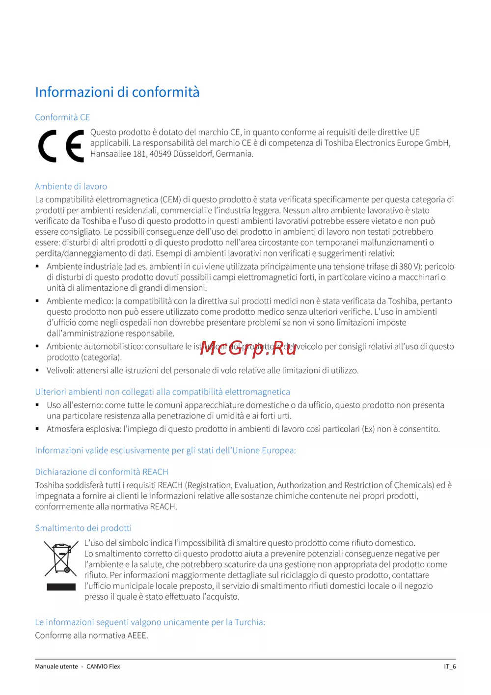 applicabili. La responsabilità del marchio CE è di competenza di Toshiba Electronics Europe GmbH,