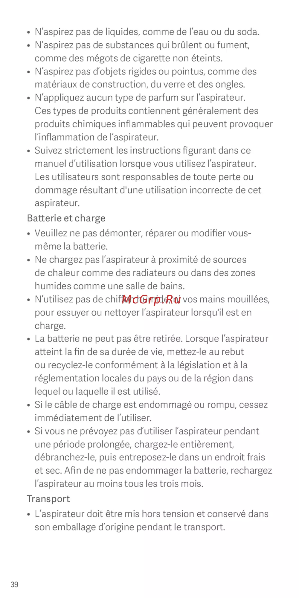 • N’appliquez aucun type de parfum sur l’aspirateur.