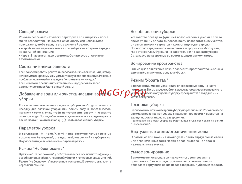 Спящий режим Возобновление уборки Робот пылесос автоматически переходит в спящий режим после 5 минут бездействия Нажмите любую кнопку или используйте Устройство оснащено функцией возобновления уборки Если во время уборки у робота пылесоса почти разрядится аккумулятор приложение чтобы вернуть его в активный режим он автоматически вернется на док станцию для зарядки Устройство не переключается в спящий режим во время зарядки Полностью зарядившись он вернется и продолжит уборку там на зарядной док станции где остановился Функция не работает если задача по уборке Через 12 часов в спящем режиме робот пылесос отключается автоматически была завершена вручную во время зарядки аккумулятора Зонирование пространства Состояние неисправности С помощью приложения можно разделить пространство на зоны а затем выбрать нужную зону для уборки Если во время работы робота пылесоса возникнетошибка индикатор начнет мигать красным и вы услышите звуковое оповещение Решение проблемы можно найти в разделе Устранение неполадок Если ничего не предпринять втечение 5 минут робот пылесос Режим Убрать там автоматически перейдет в спящий режим В приложении можно установить определенную зону на карте помещения В этом случае робот пылесос автоматически отправится в Добавление воды или очистка насадки во время уборки указанное место и осуществит уборку пространства площадью 2 2 Если во время выполнения задачи насадку для влажной уборки или нажмите любую кнопку чтобы по уборке необходимо очистить долить воду в робот пылесос приостановить работу и извлеките отсек для воды После добавления воды или очистки насадки верните все наместо и нажмите кнопку чтобы возобновить уборку Параметры уборки В приложении М Ноте Х аогт Ноте доступно четыре режима метра вокруг себя Плановая уборка В приложении можно настроить уборку по расписанию Робот пылесос автоматически начнет уборку в назначенное время и вернется на зарядную док станцию по завершении Примечание Плановая уборка не будет выполняться если включен режим Не беспокоить Виртуальные стены ограниченные зоны всасывания беззвучный стандартный умеренный и турборежим С помощью приложения можно установить виртуальные стены По умолчанию установлен стандартный режим или ограниченные зоны чтобы робот пылесос не попал в нежелательные места Режим Не беспокоить В режиме Не беспокоить у робота пылесоса отключаются функции Умное зонирование возобновления уборки плановой уборки и голосовых уведомлений Вы можете использовать функцию умного зонирования в Режим Не беспокоить включен по умолчанию Его можно выключить через приложение приложении С ее помощью робот пылесос автоматически обновляет карту помещения после завершения уборки и зарядки
