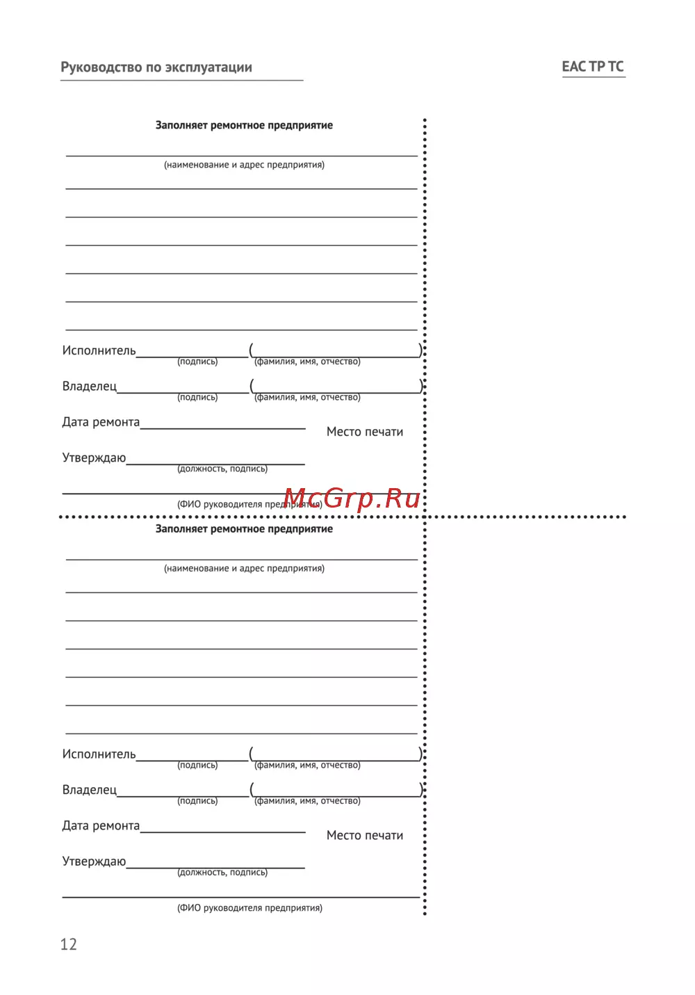 ЕАСТРТС Руководство по эксплуатации Заполняет ремонтное предприятие наименование и адрес предприятия И с п ол н ител ь__ _____ ____________________ _________ подпись фамилия имя отчество Вл а дел е ц____________ ___________________ _________ подпись фамилия имя отчество Дата ремонта Место печати Ут в е р жд а ю____ _____________ _____ должность подпись ФИО руководителя предприятия Заполняет ремонтное предприятие наименование и адрес предприятия И с п ол н ител ь__ _____ ___________________ _________ подпись фамилия имя отчество В л а де л е ц_____ _____ __ __________________ _________ подпись фамилия имя отчество Дата ремонта Место печати Утве ржда ю______ _____________ _____ должность подпись ФИО руководителя предприятия 12