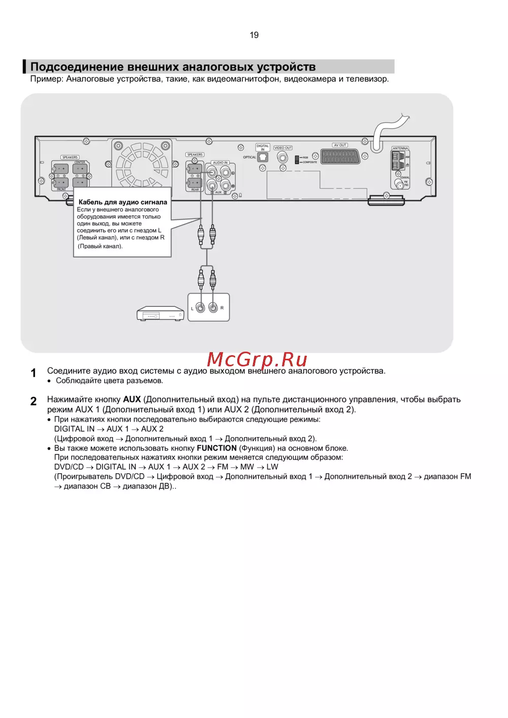 - Нажимайте кнопку aux дополнительный вход на пульте дистанционного управления чтобы выбрать режим aux 1 дополнительный вход 1 или aux 2 дополнительный вход 2 p.17
