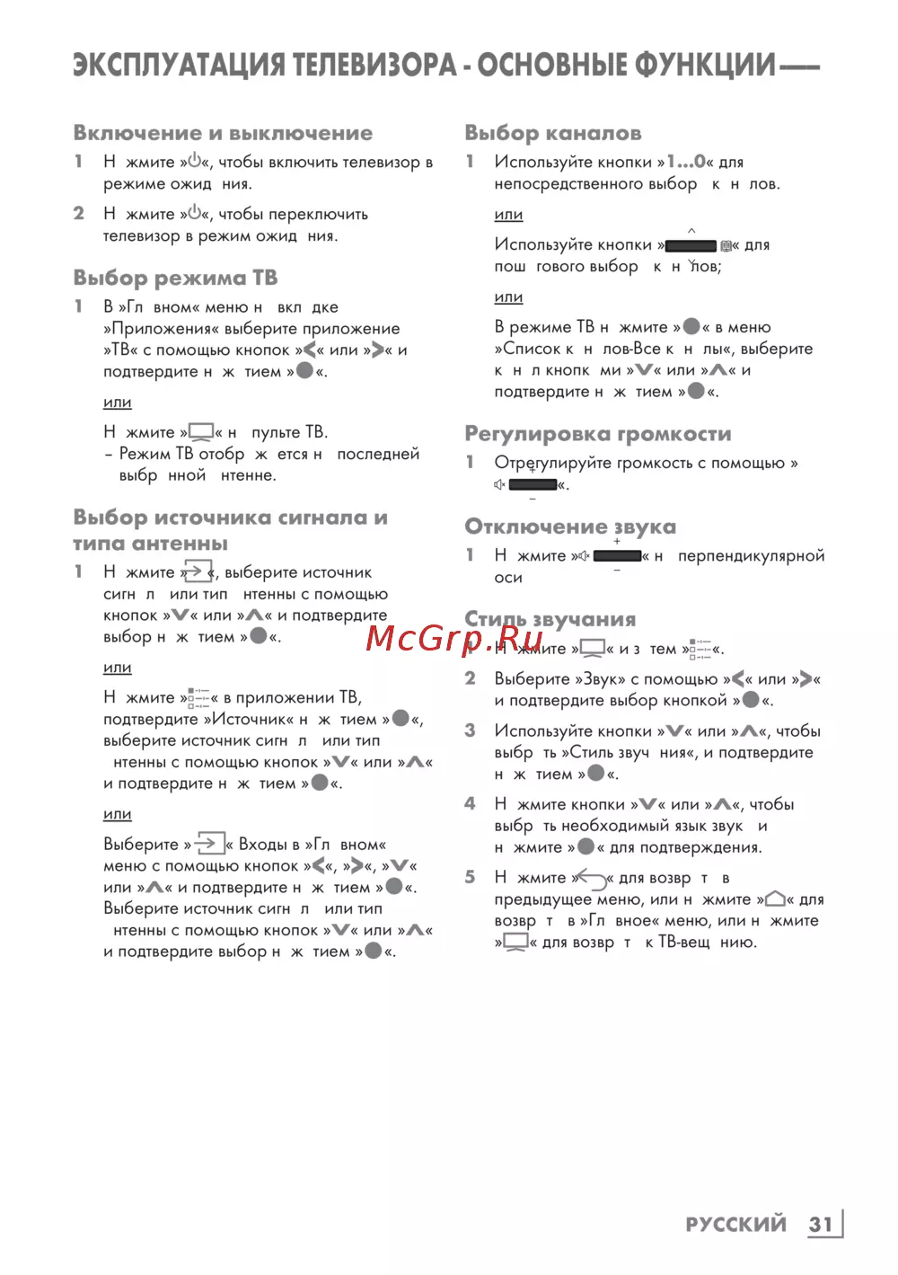 Узнайте, как включать и выключать телевизор, выбирать режимы и каналы, а также настраивать звук. Полное руководство по эксплуатации вашего устройства.