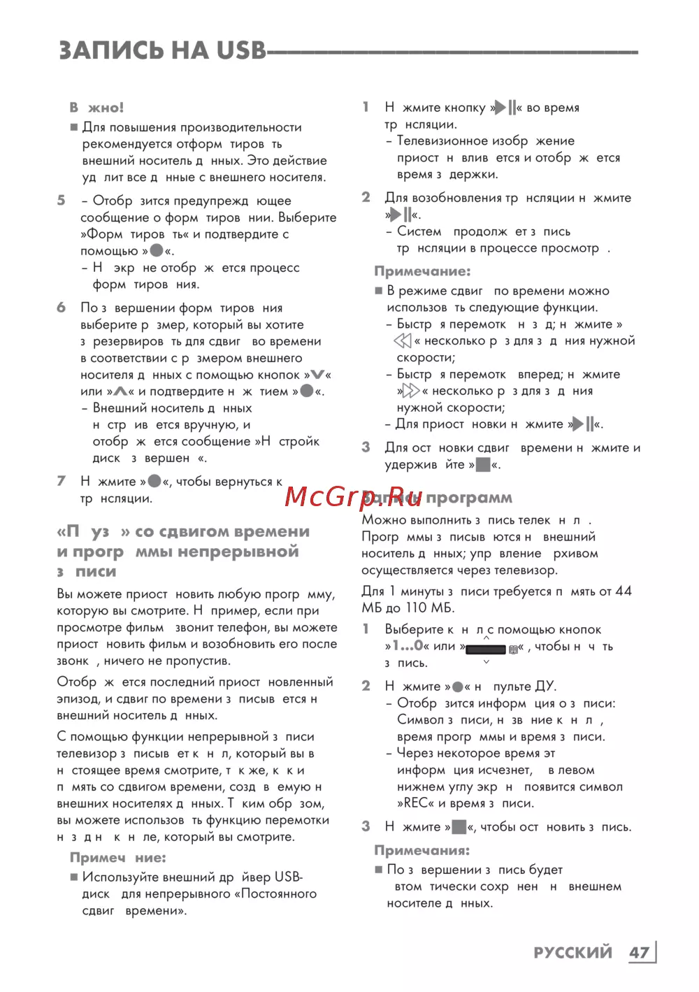 Grundig 50GGU7900B — запись на USB: настройка и использование функций сдвига времени [47/124]