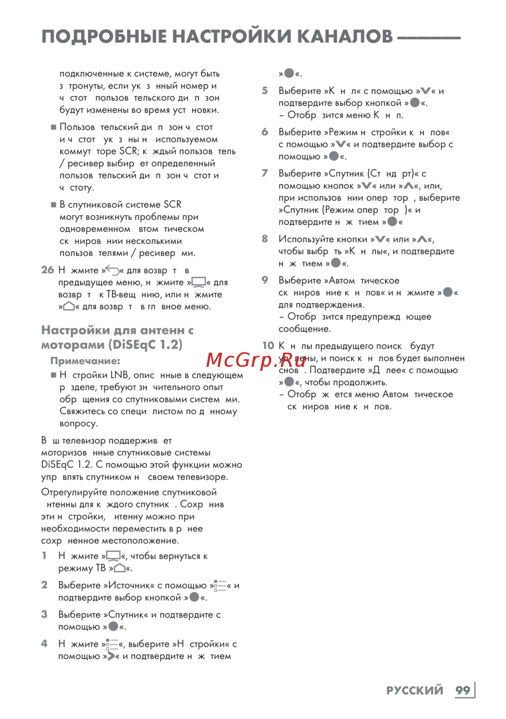 - Настройки антенны для цифровых спутниковых каналов и автоматический поиск каналов с помощью системы scr p.97