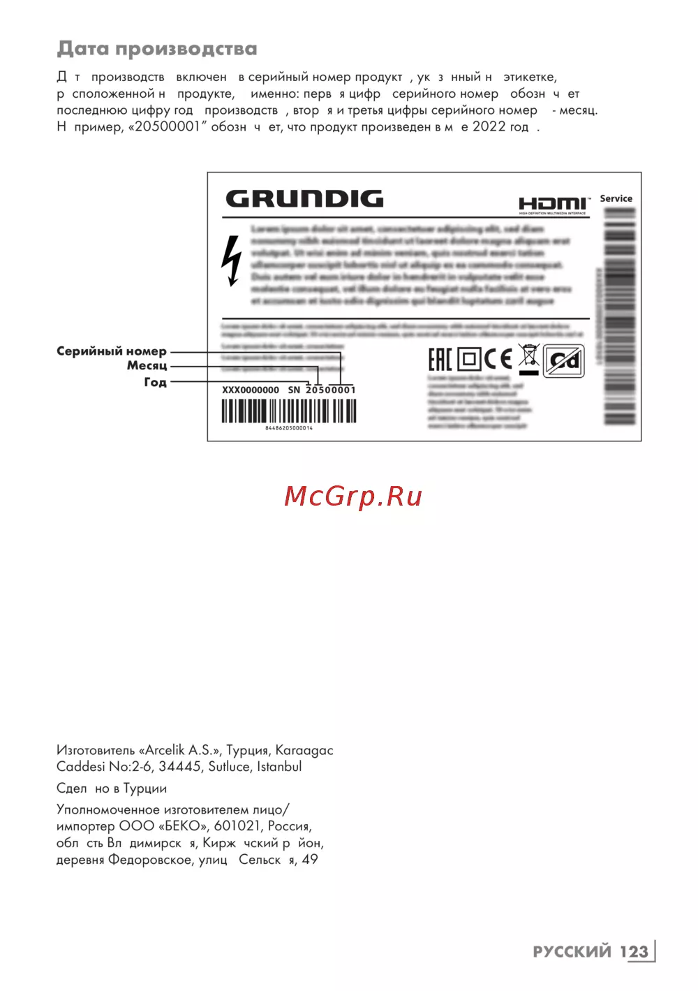 Grundig 65GGU7900B — информация о производителе и дате производства продукции [123/124]