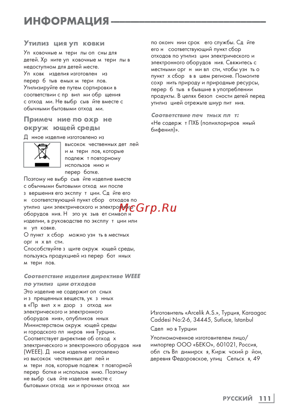 Изготовитель «Arcelik A.S.», Турция, Karaagac