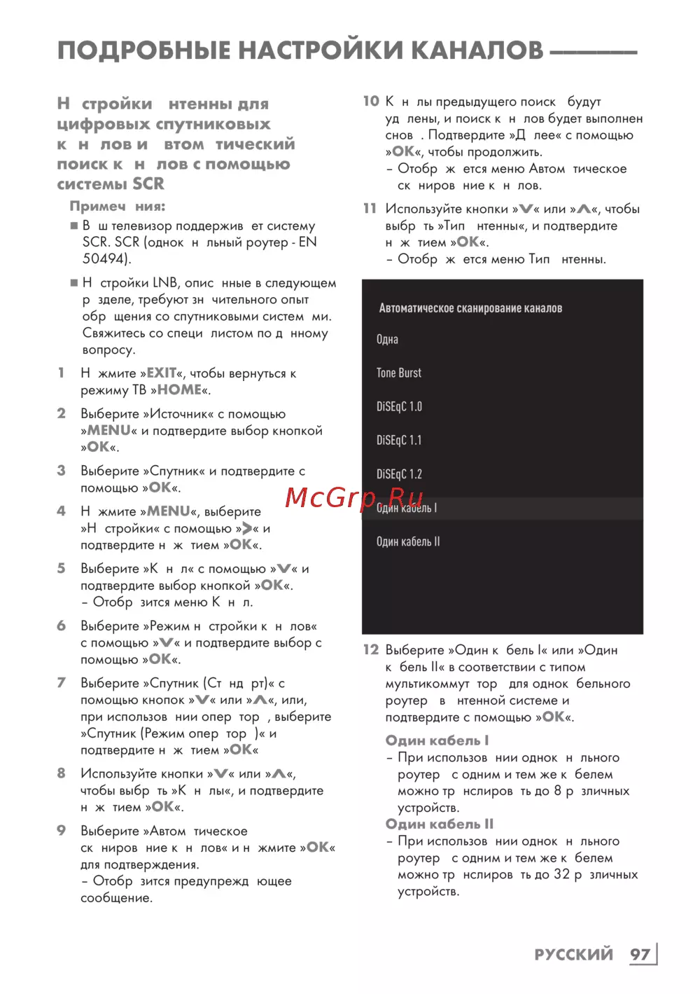 - Настройки антенны для цифровых спутниковых каналов и автоматический поиск каналов с помощью системы scr p.97
