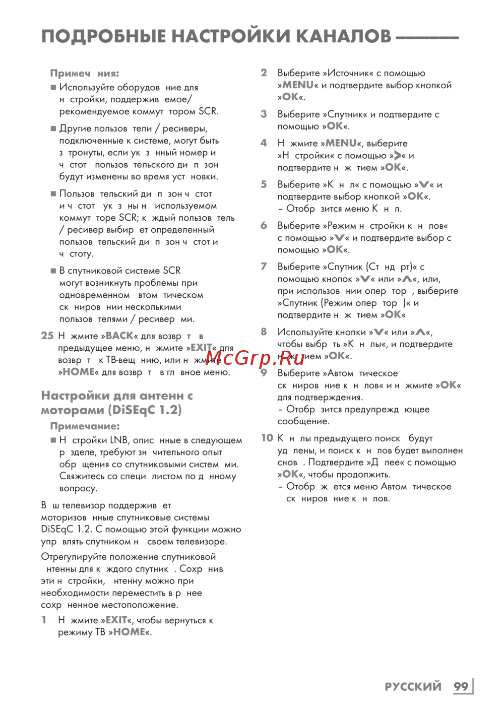 - Настройки антенны для цифровых спутниковых каналов и автоматический поиск каналов с помощью системы scr p.97