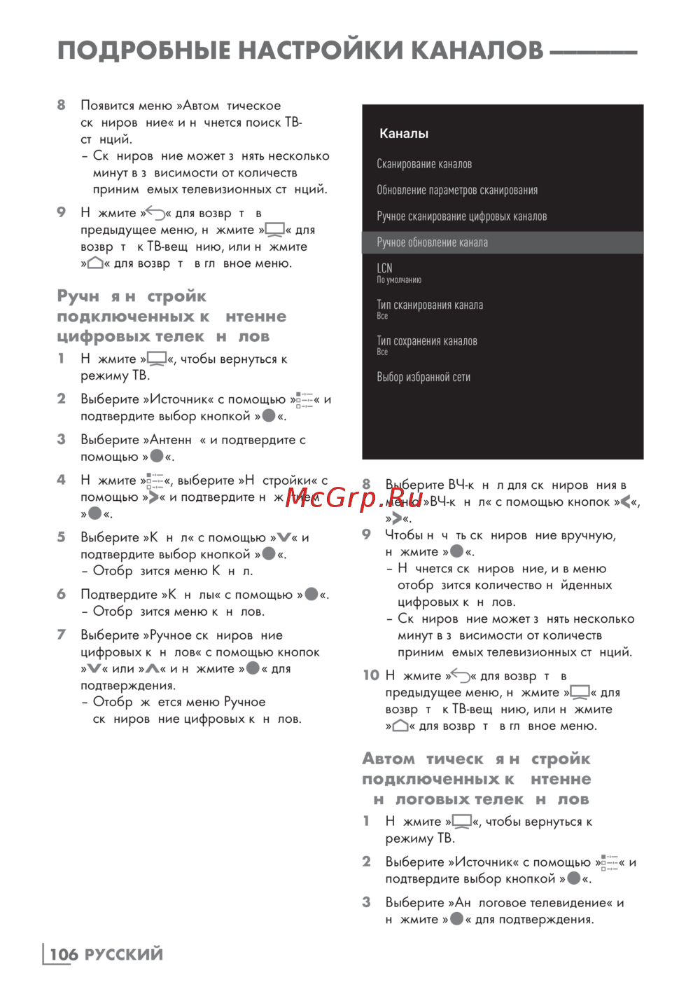 - Ручная настройка подключенных к антенне аналоговых телеканалов p.108