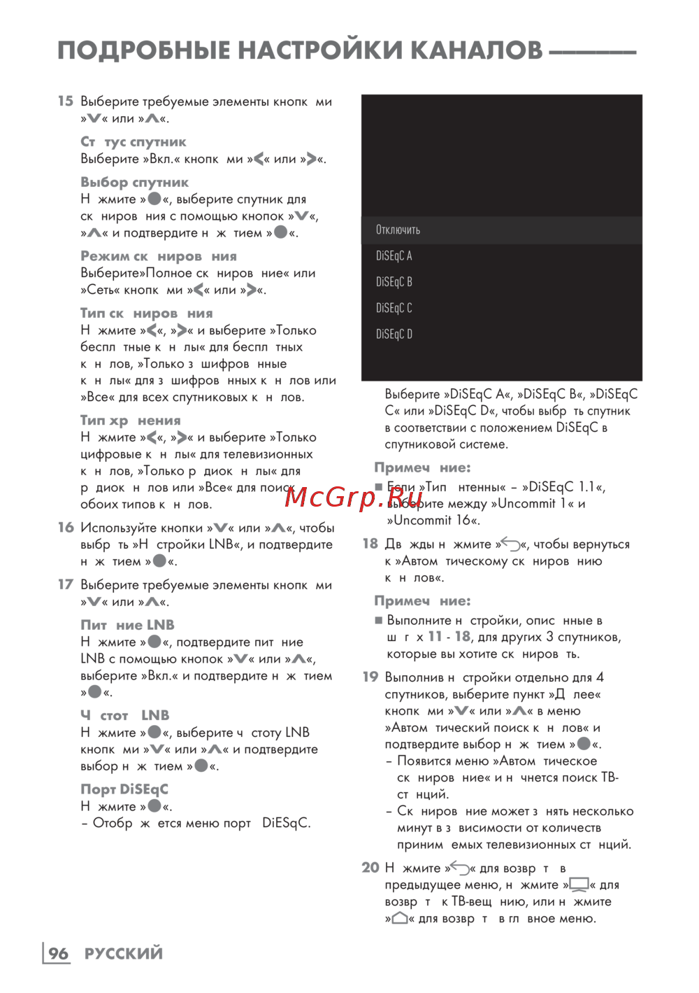 - Настройки антенны для цифровых спутниковых каналов и автоматический поиск каналов с помощью diseqc 1 1 p.95