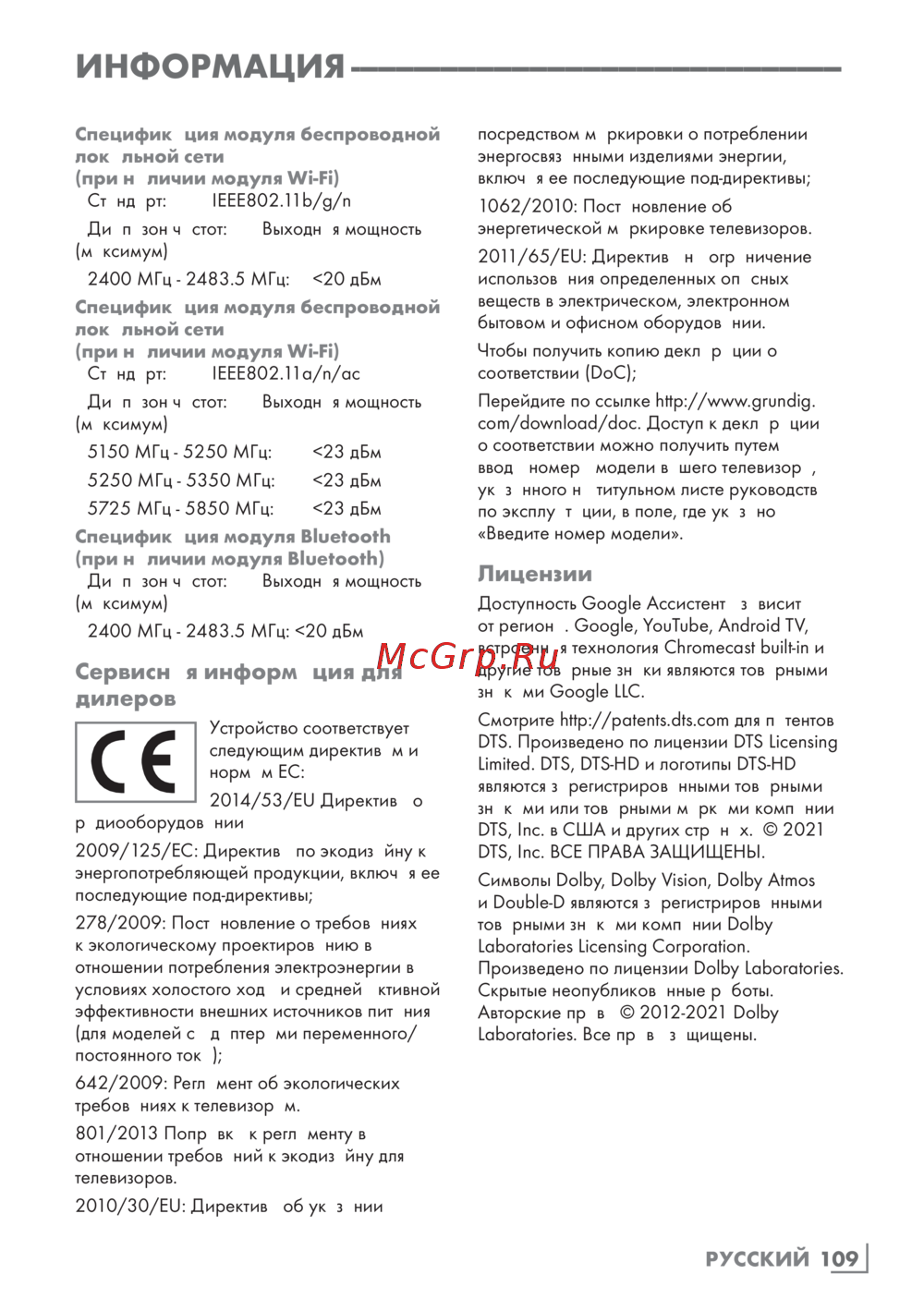 Grundig 65OLEDGG970B — спецификации беспроводных модулей и директивы ЕС [109/124]