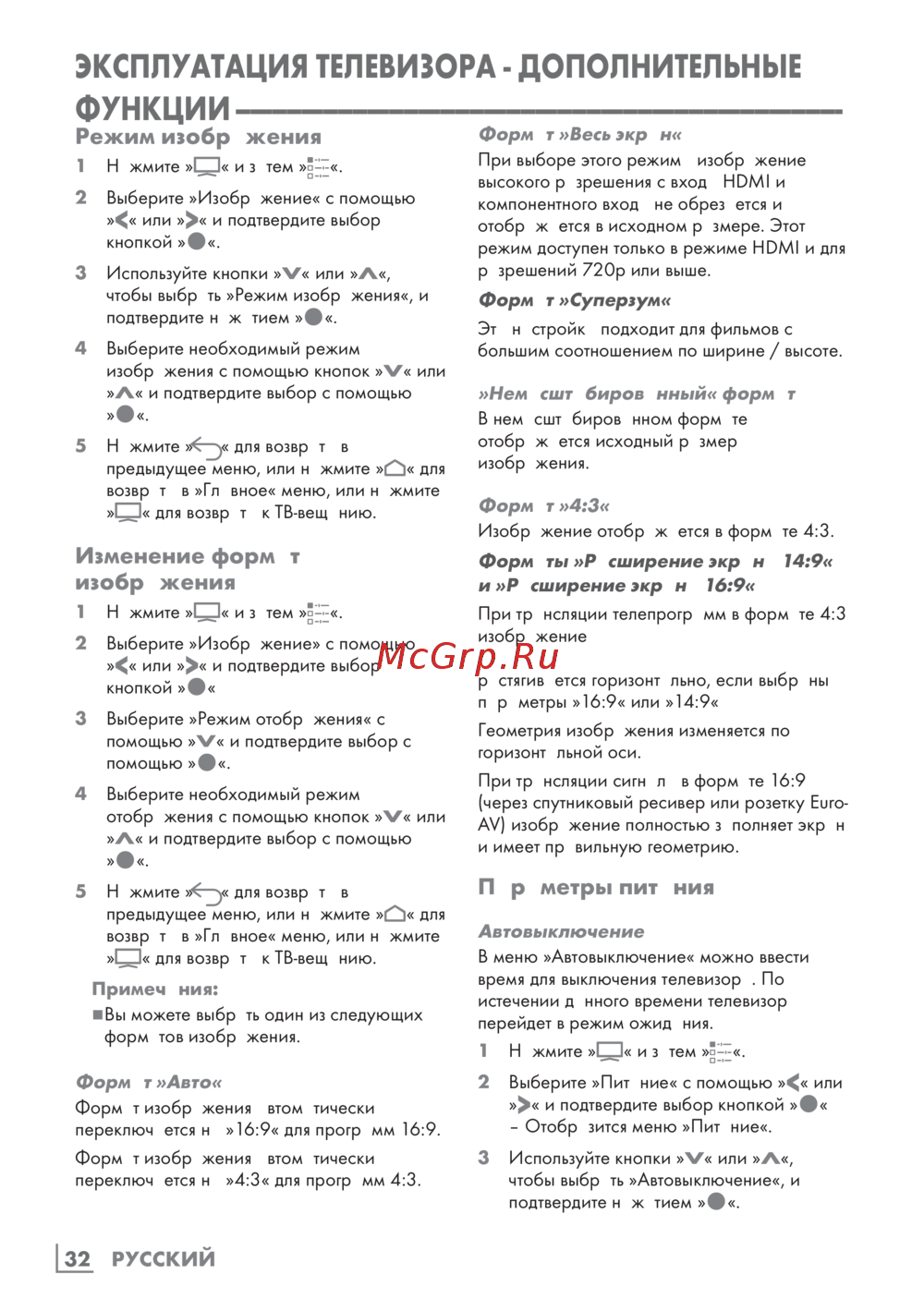 Узнайте, как настроить режим изображения и дополнительные функции вашего телевизора. Подробные инструкции по выбору формата и управлению питанием.