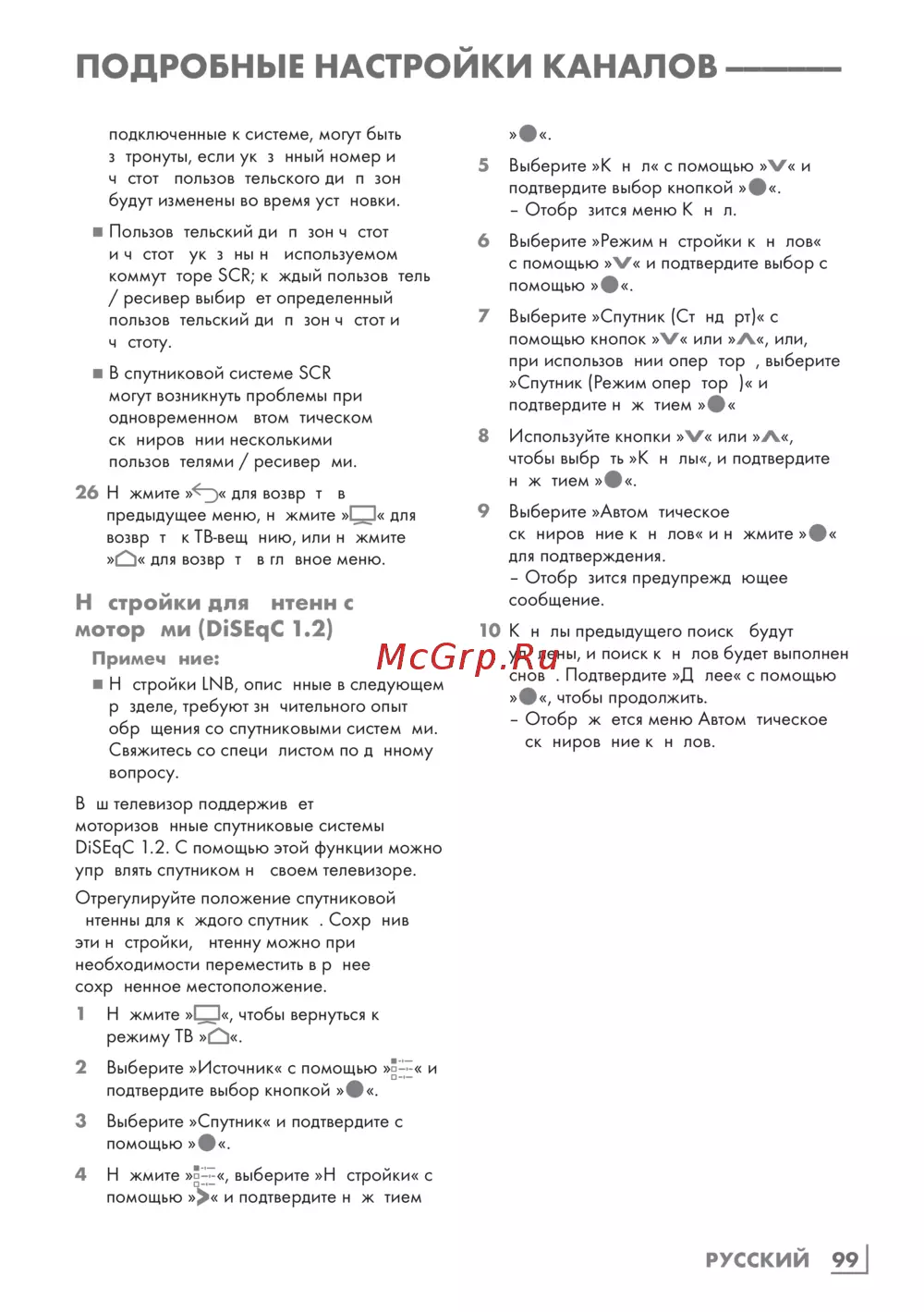 - Настройки антенны для цифровых спутниковых каналов и автоматический поиск каналов с помощью системы scr p.97