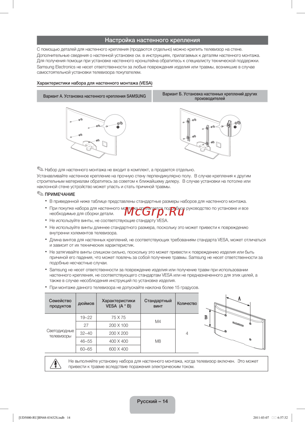 Вариант А. Установка настенного крепления SAMSUNG