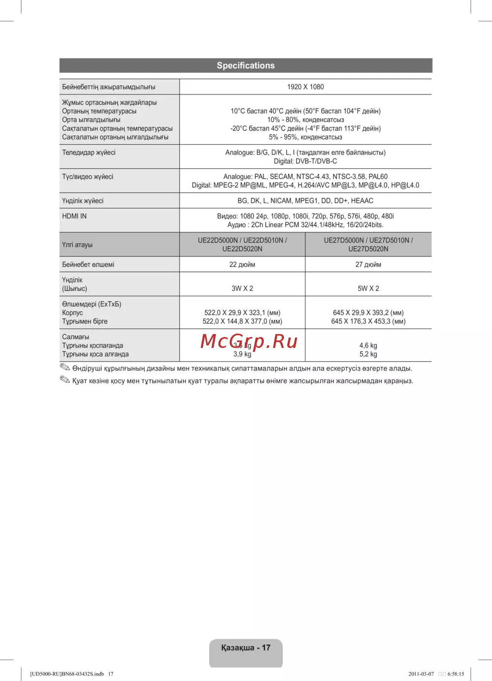 Samsung UE27D5010NW [65/65] Өндірушіxқұрылғыныңxдизайныxменxтехникалықxсипаттамаларынxалдынxалаxескертусізxөзгертеxалады
