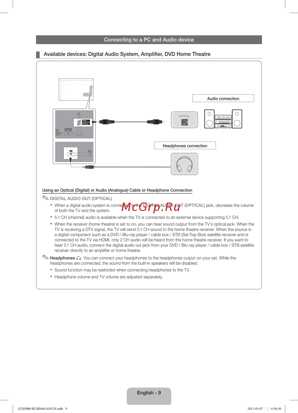 Using an Optical (Digital) or Audio (Analogue) Cable or Headphone Connection