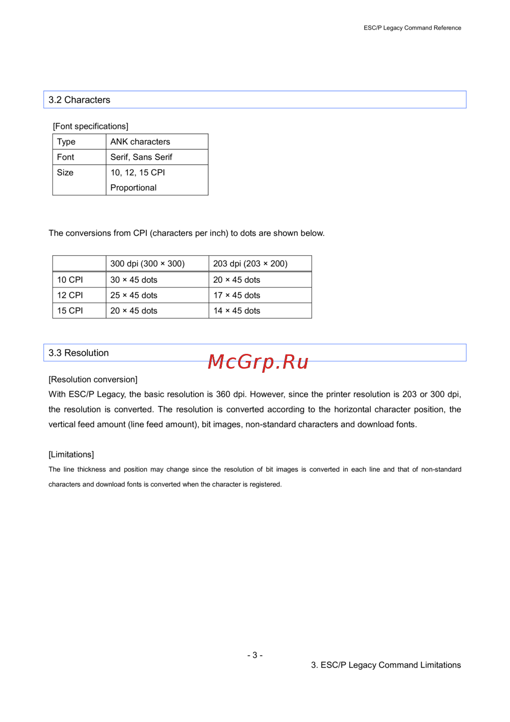 With ESC/P Legacy, the basic resolution is 360 dpi. However, since the printer resolution is 203 or 300 dpi,