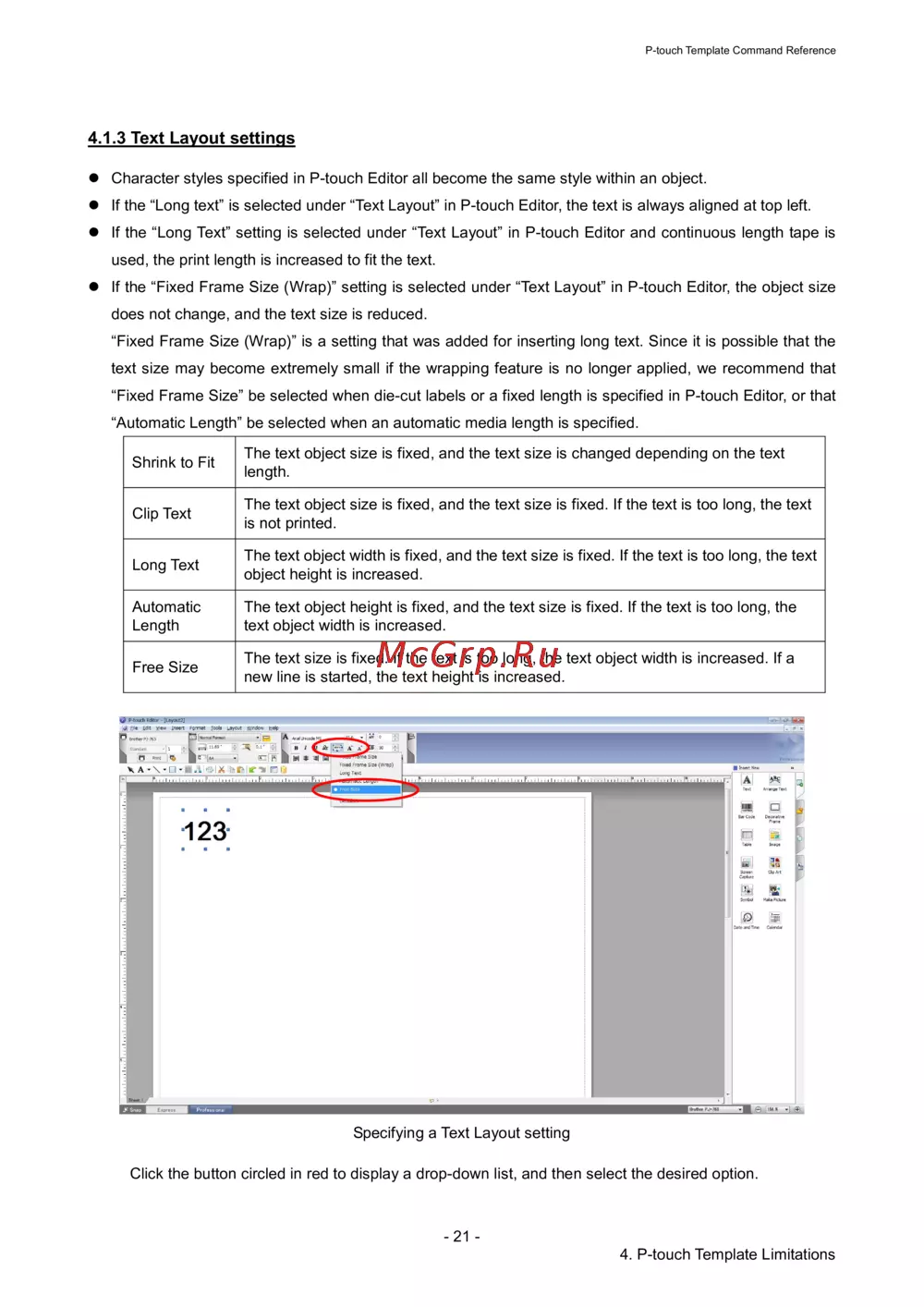 If the “Fixed Frame Size (Wrap)” setting is selected under “Text Layout” in P-touch Editor, the object size