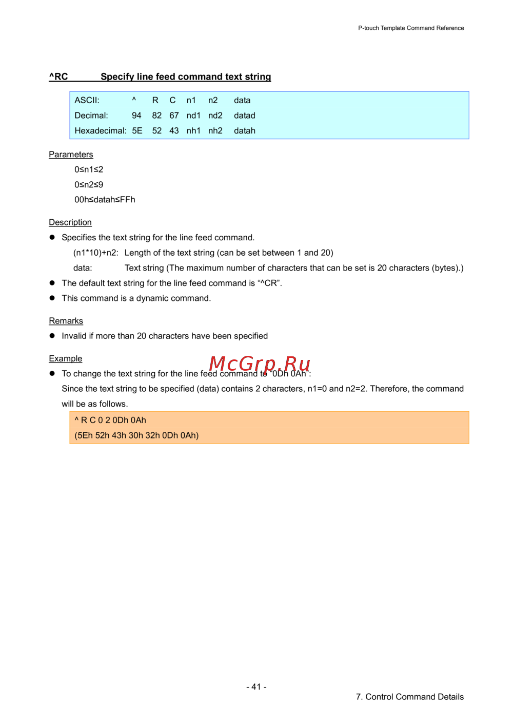 - Rc specify line feed command text string p.46