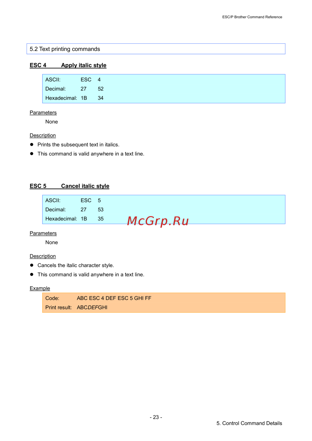 ESC 5 Cancel italic style