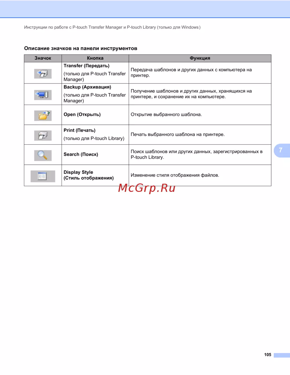- Инструкции по работе с p touch transfer manager и p touch library только для windows 102 p.7