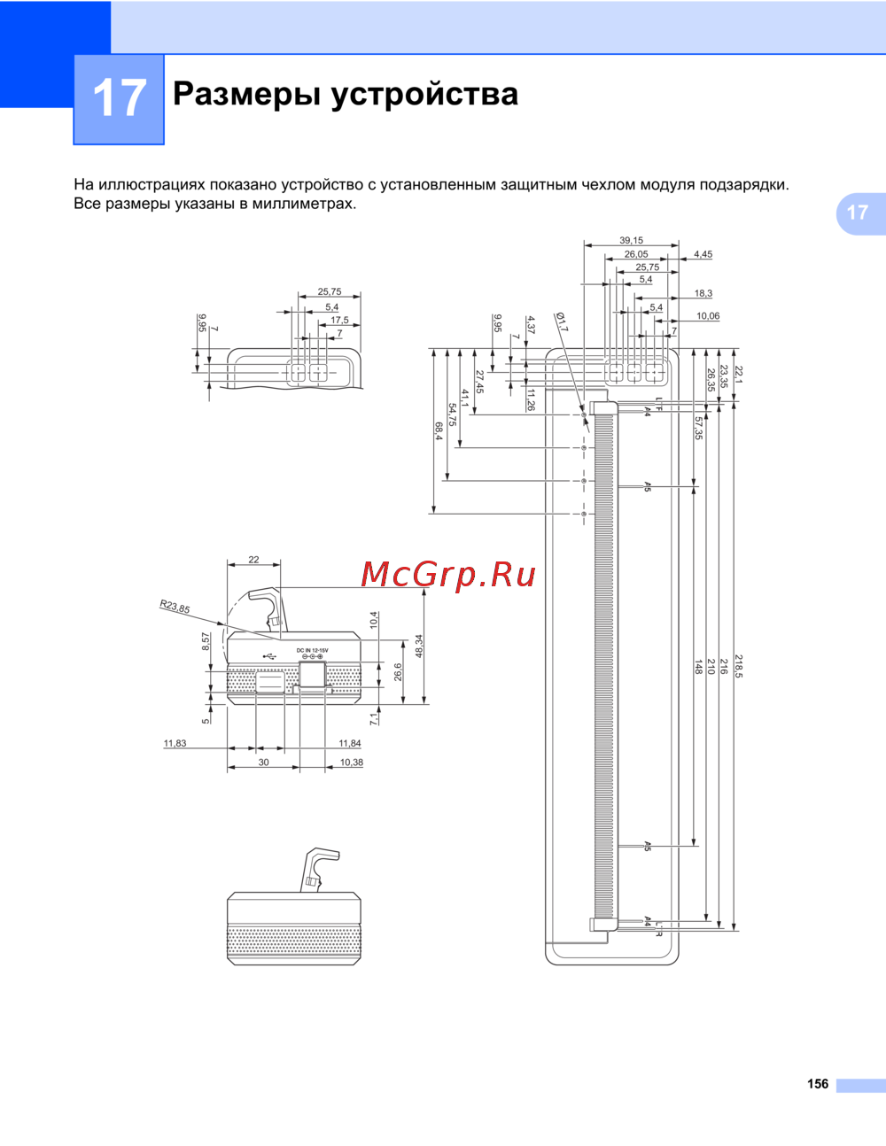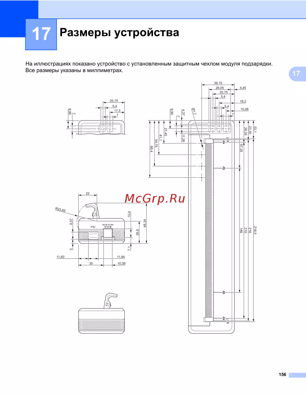 - На иллюстрациях показано устройство с установленным защитным чехлом модуля подзарядки все размеры указаны в миллиметрах p.164