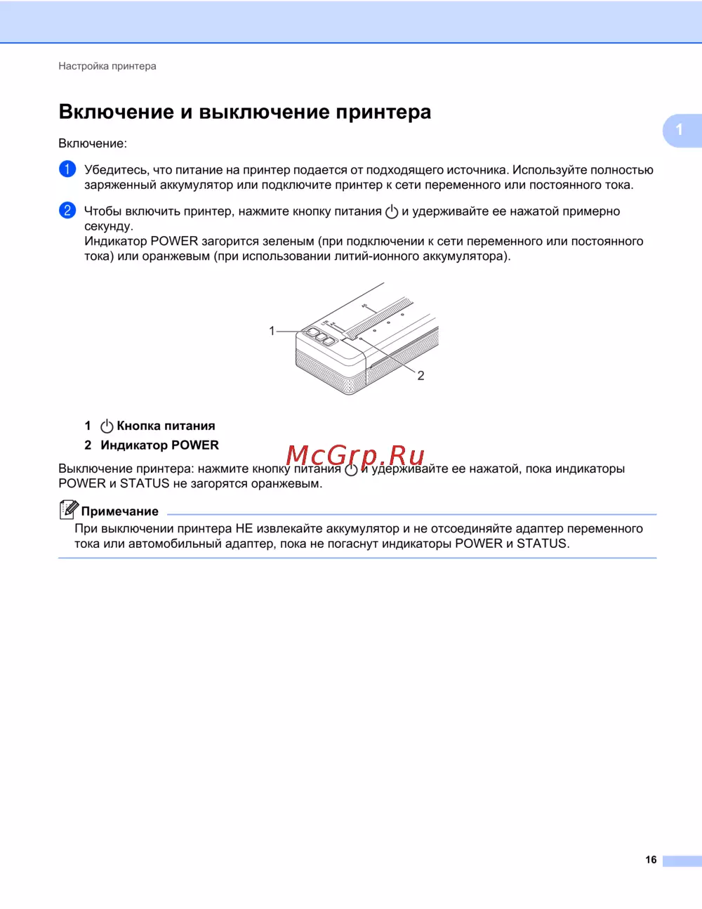 При выключении принтера НЕ извлекайте аккумулятор и не отсоединяйте адаптер переменного