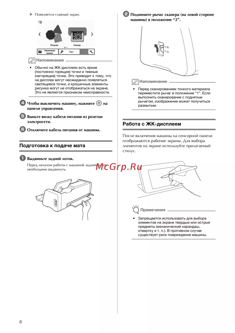 - Если при нажатии на экранные кнопки экран не реагирует надлежащим образом машина не выполняет операции или выполняет не те операции которые должна то для выполнения соответствующих регулировок выполните описанные ниже шаги p.104