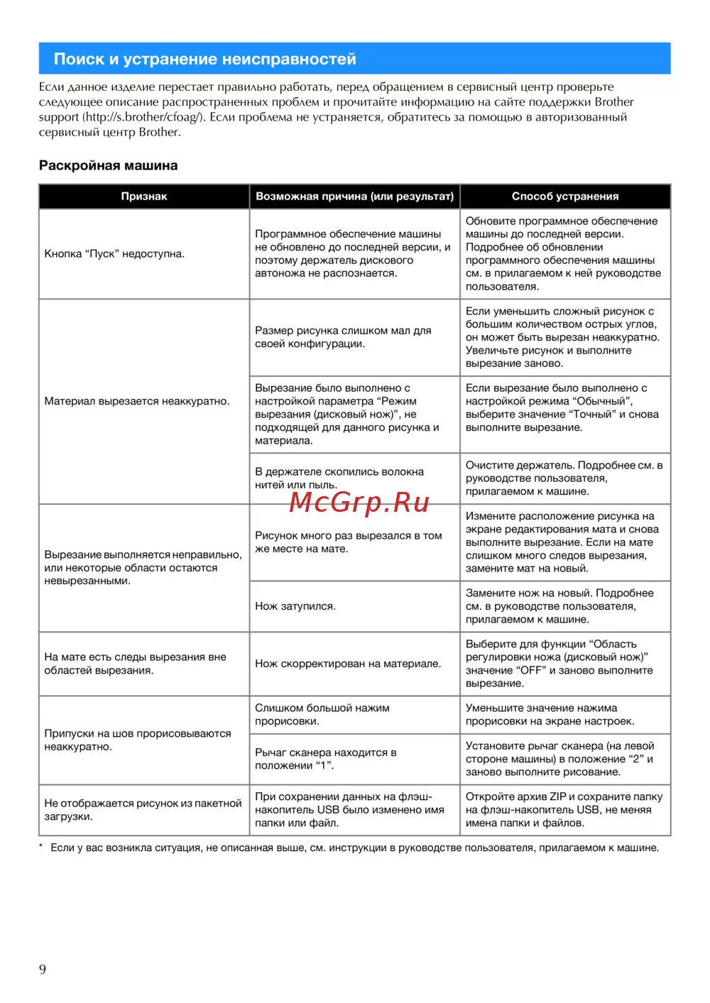 - Если данное изделие перестает правильно работать перед обращением в сервисный центр проверьте следующее описание распространенных проблем и прочитайте информацию на сайте поддержки brother support http s brother cfoag если проблема не устраняется обратитесь за помощью в авторизованный сервисный центр brother p.9