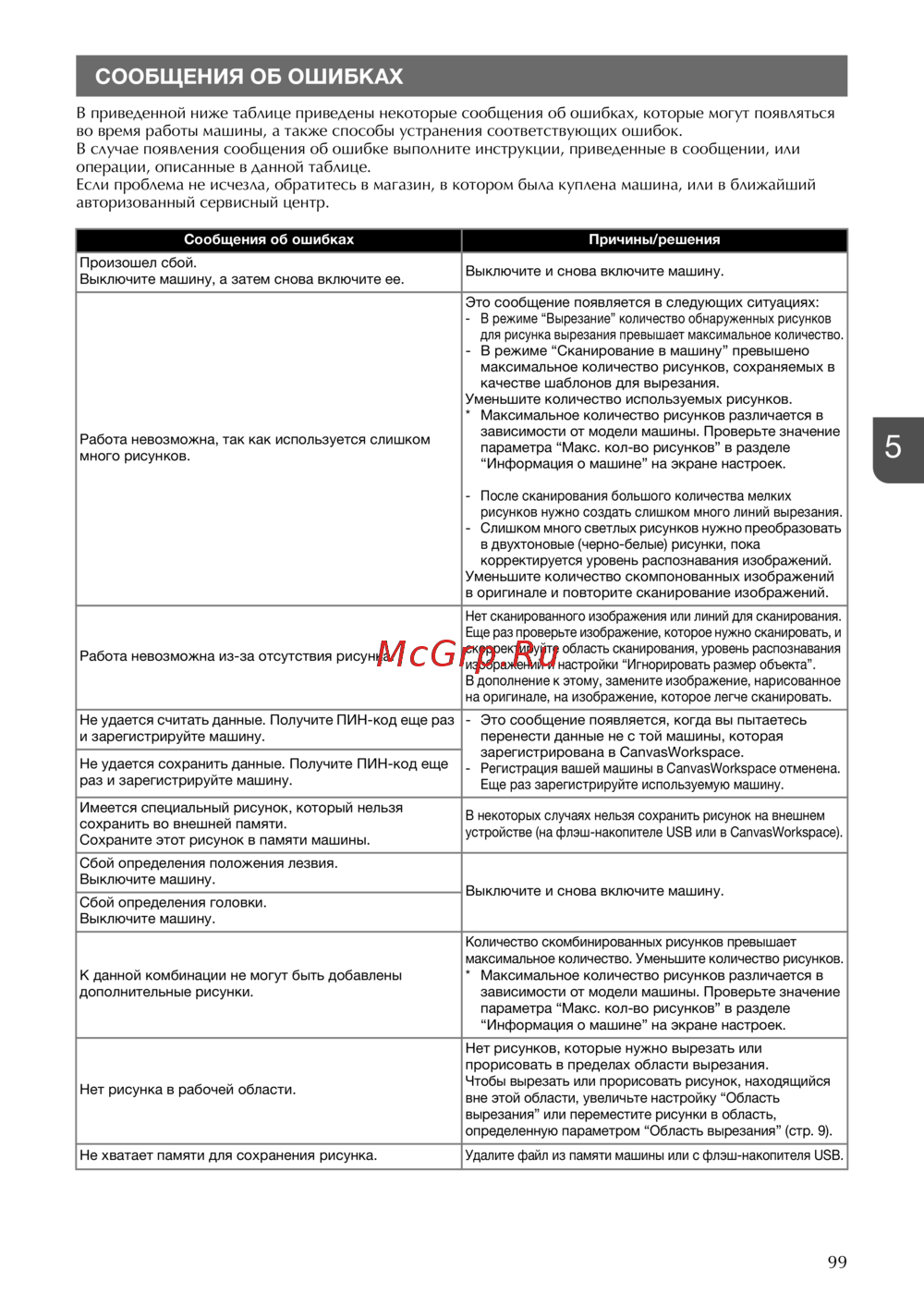 ![Brother ScanNCut SDX1200 [111/120] В приведенной ниже таблице приведены некоторые сообщения об ошибках которые могут появляться во время работы машины а также способы устранения соответствующих ошибок в случае появления сообщения об ошибке выполните инструкции приведенные в сообщении или операции описанные в данной таблице если проблема не исчезла обратитесь в магазин в котором была куплена машина или в ближайший авторизованный сервисный центр](/views2/1897145/page111/bg6f.png)