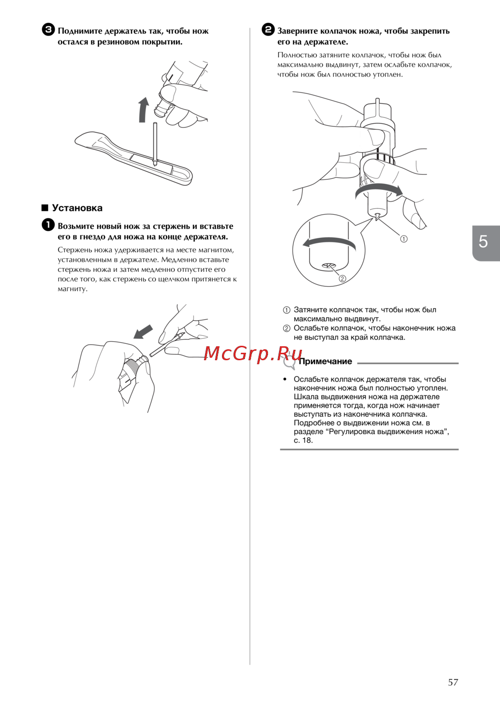 - Заверните колпачок ножа чтобы закрепить его на держателе p.59
