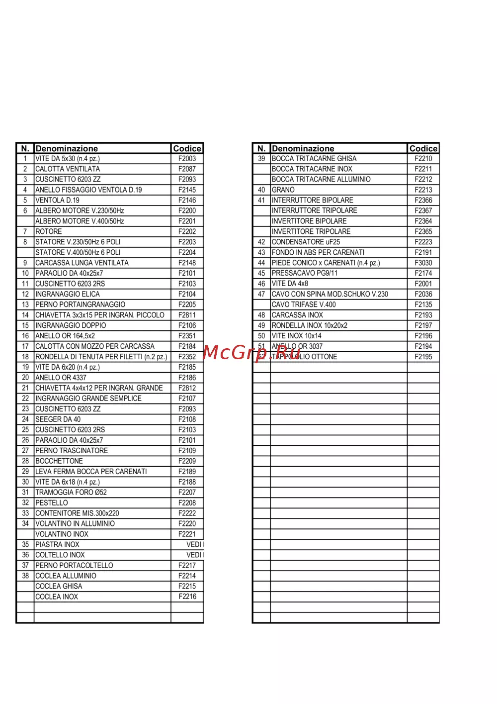 1 VITE DA 5x30 (n.4 pz.) F2003 0,52 € 39 BOCCA TRITACARNE GHISA F2210 43,68 €
