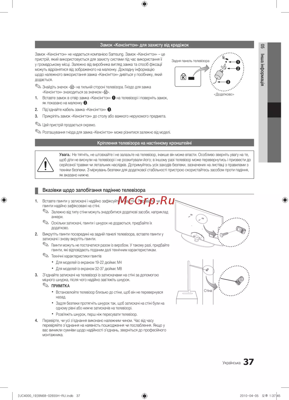 Увага.: Не тягніть, не штовхайте і не залазьте на телевізор, інакше він може впасти. Особливо зверніть увагу на те,
