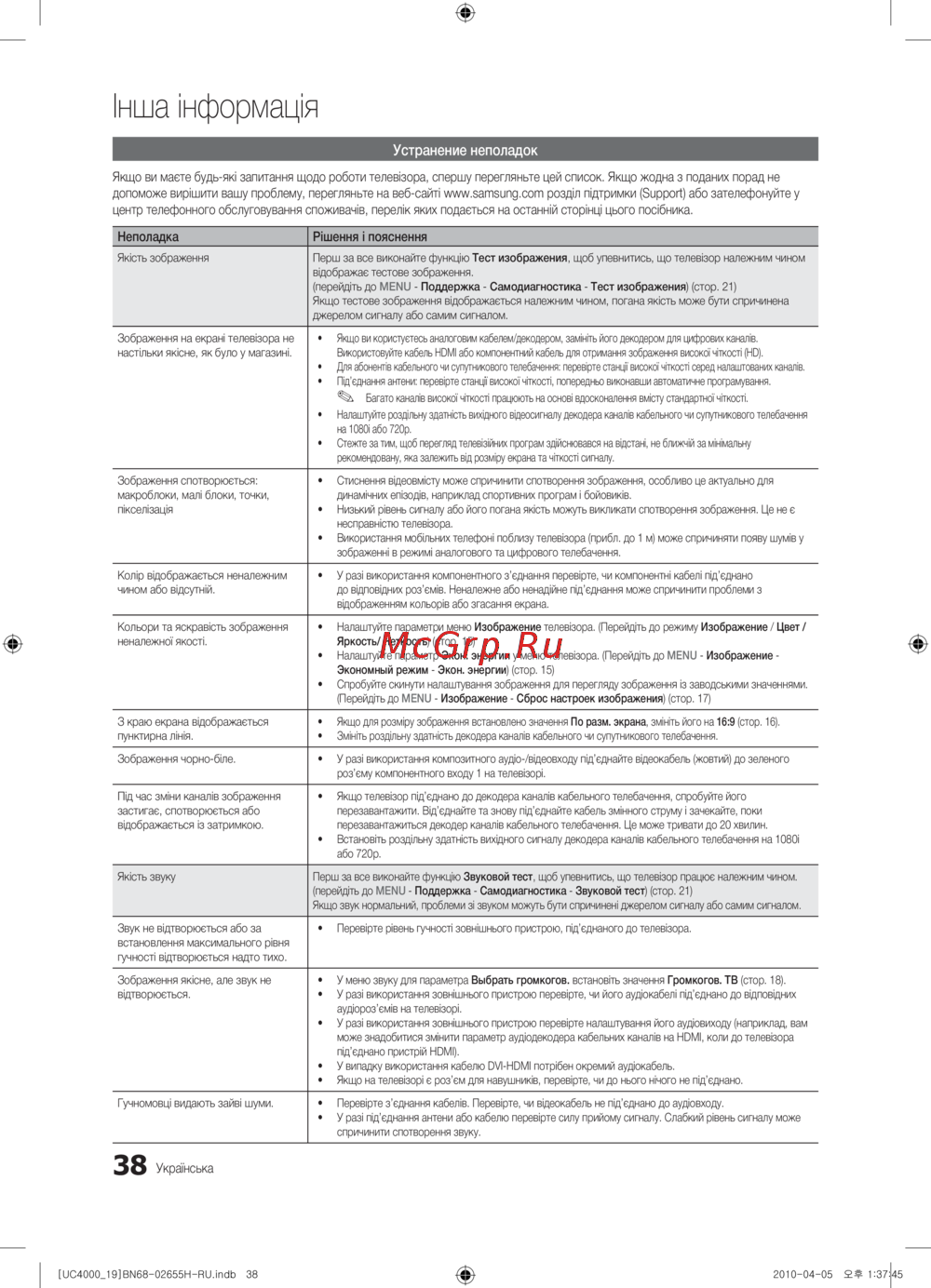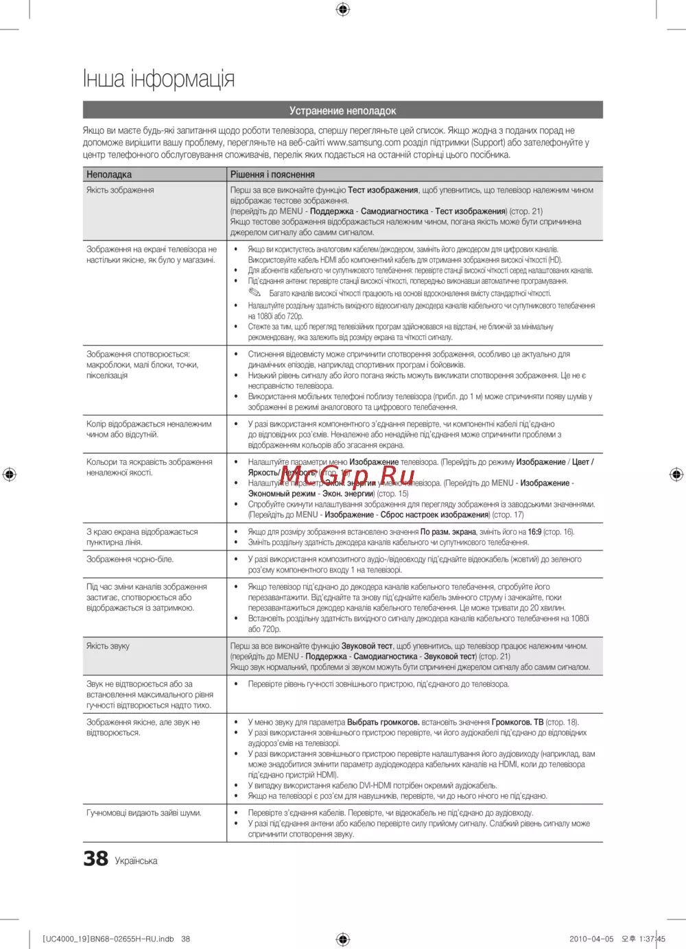 (перейдіть до MENU - Поддержка - Самодиагностика - Тест изображения) (стор. 21)