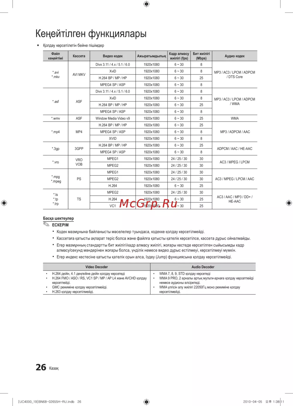 • H.264 FMO / ASO / RS, VC1 SP / MP / AP L4 және AVCHD қолдау