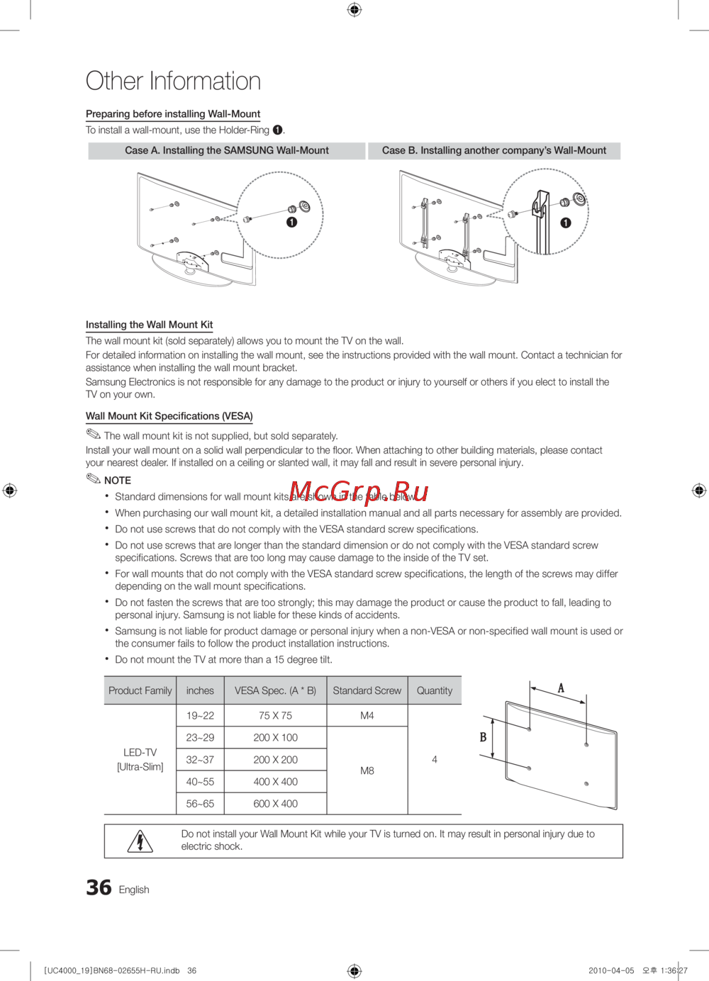 Case A. Installing the SAMSUNG Wall-Mount Case B. Installing another company’s Wall-Mount