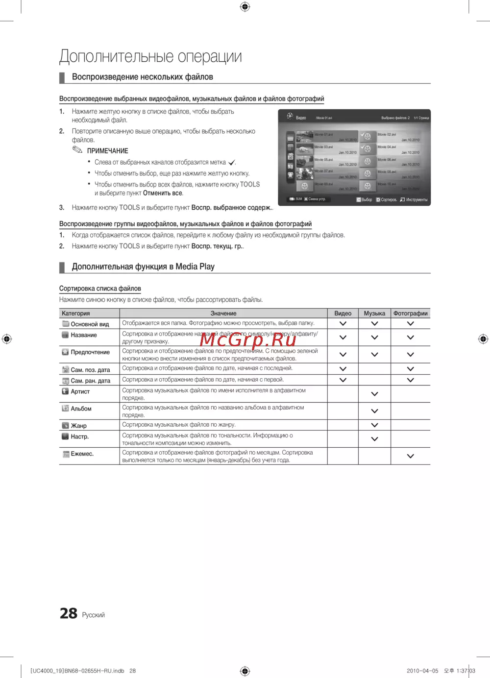 Воспроизведение группы видеофайлов, музыкальных файлов и файлов фотографий