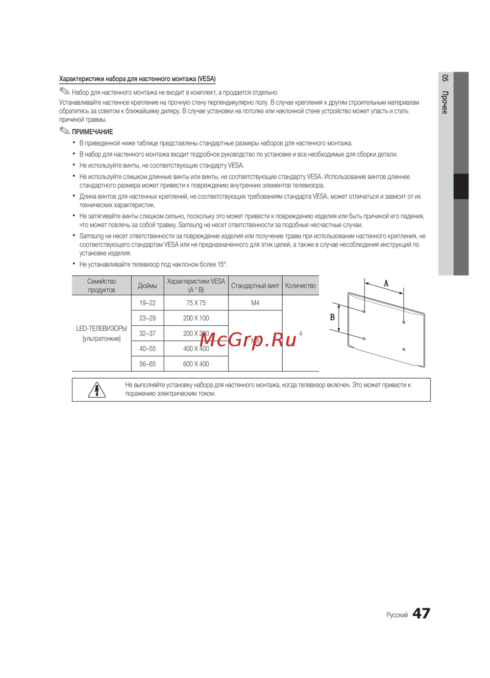 Samsung UE-55C6000RW — наборы для настенного монтажа телевизоров: инструкции, размеры VESA и безопасность [101/216]