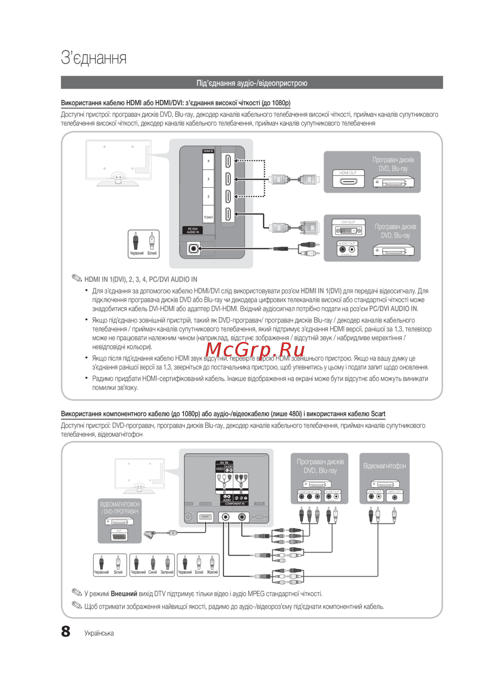Доступні пристрої: DVD-програвач, програвач дисків Blu-ray, декодер каналів кабельного телебачення, приймач каналів супутникового
