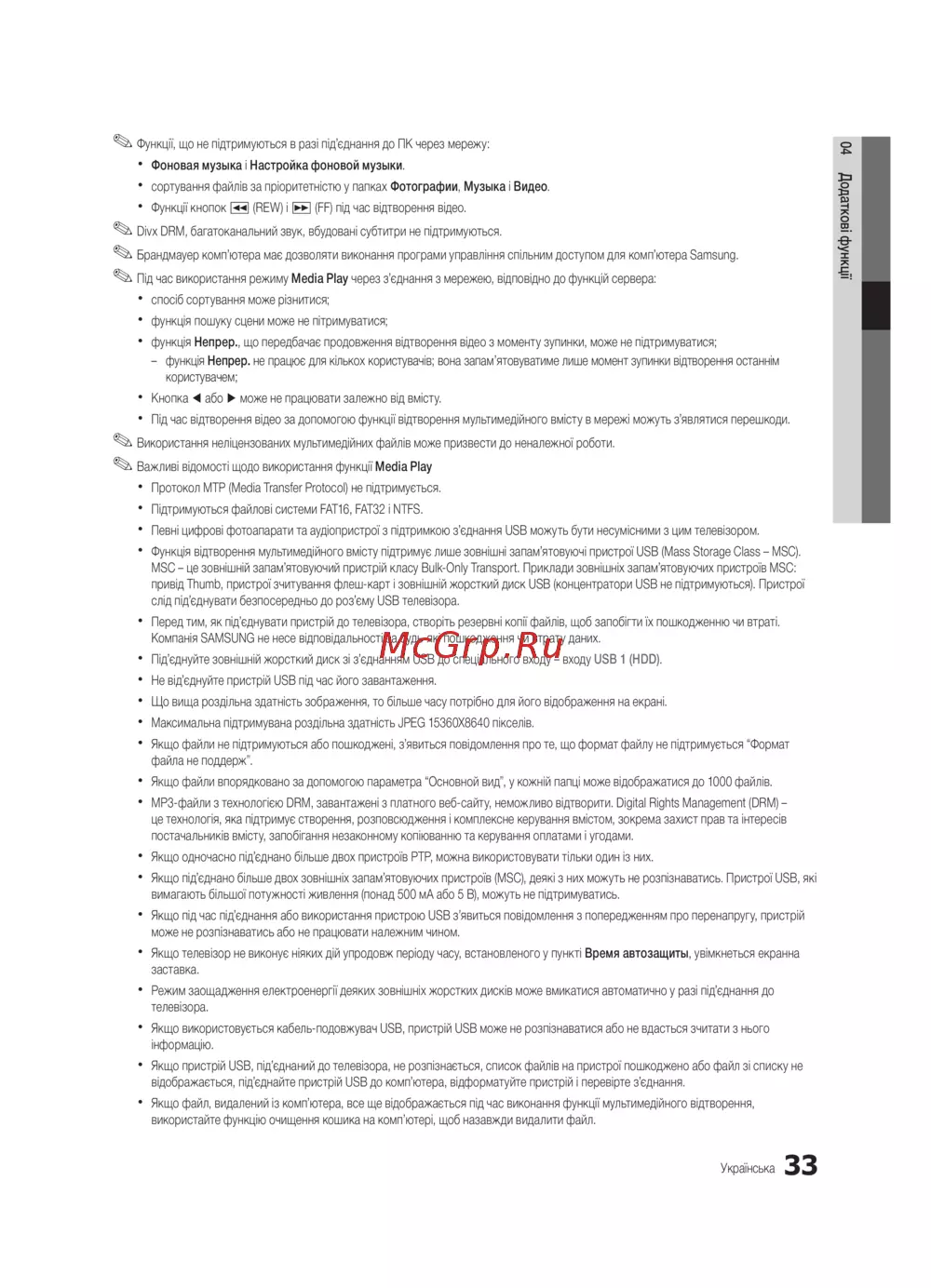 Функція відтворення мультимедійного вмісту підтримує лише зовнішні запам’ятовуючі пристрої USB (Mass Storage Class – MSC).