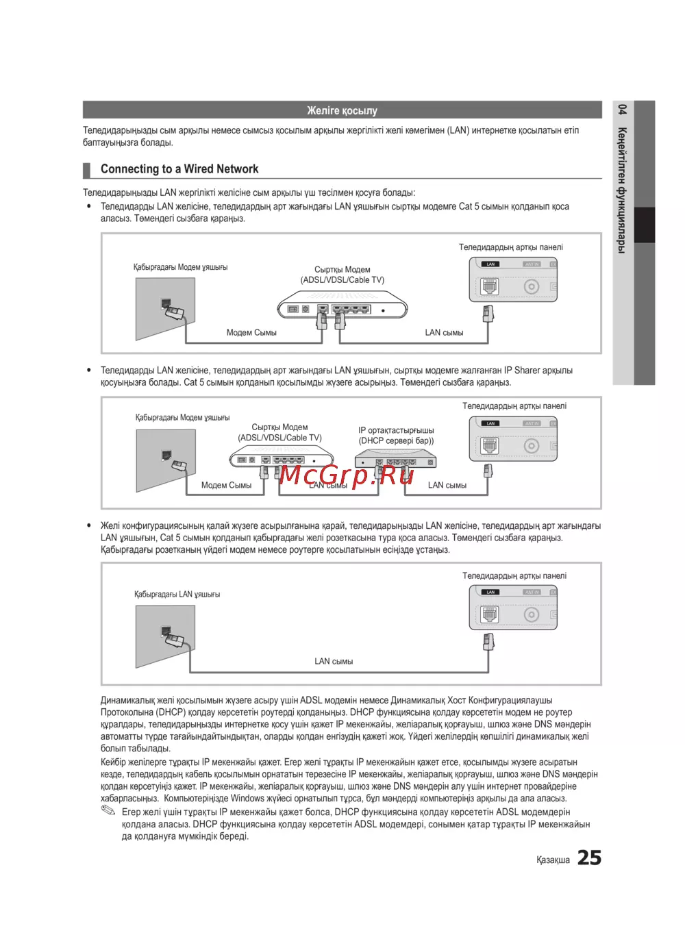 Теледидарыңызды LAN жергілікті желісіне сым арқылы үш тәсілмен қосуға болады: