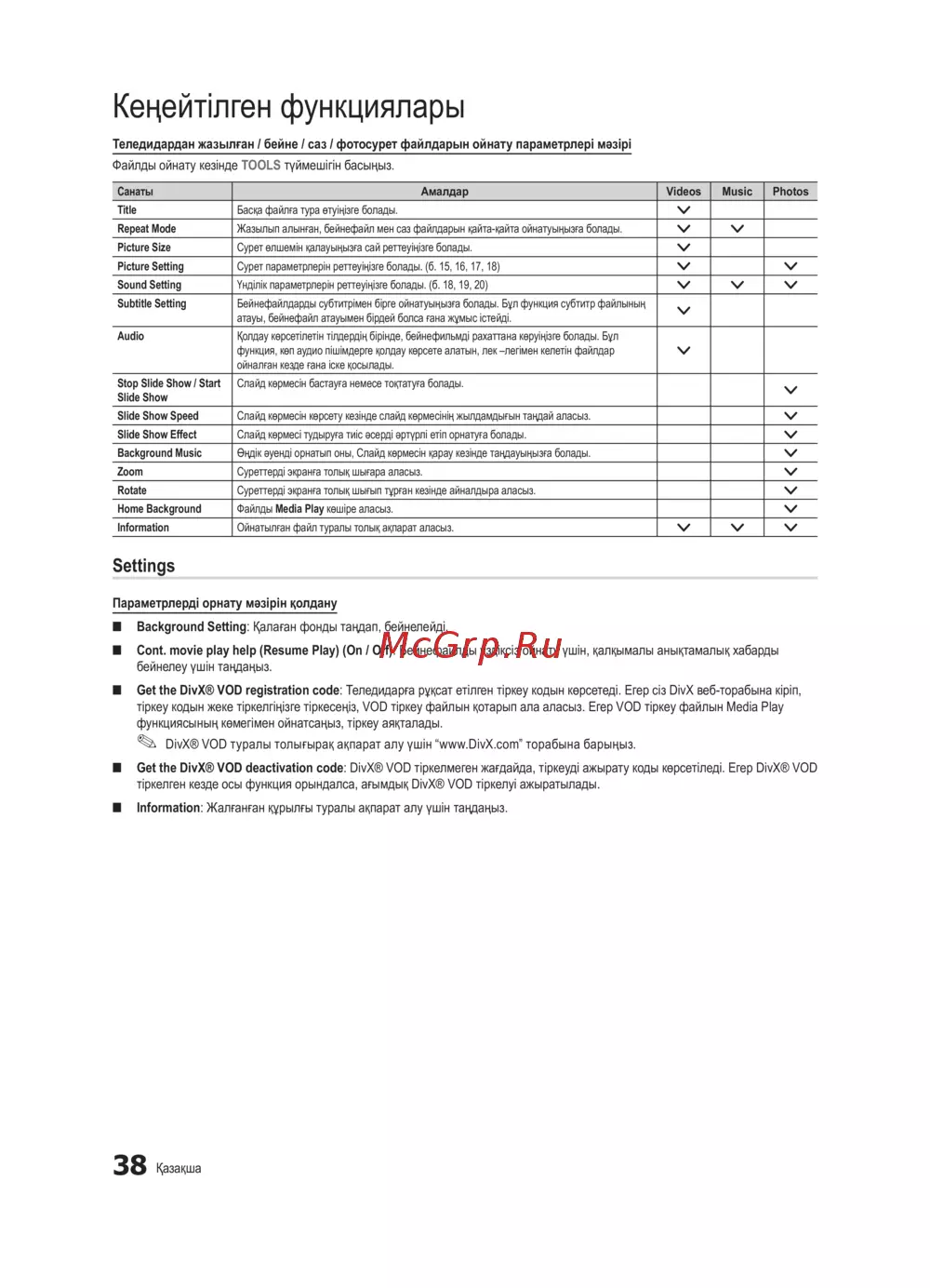 DivX® VOD туралы толығырақ ақпарат алу үшін “www.DivX.com” торабына барыңыз.