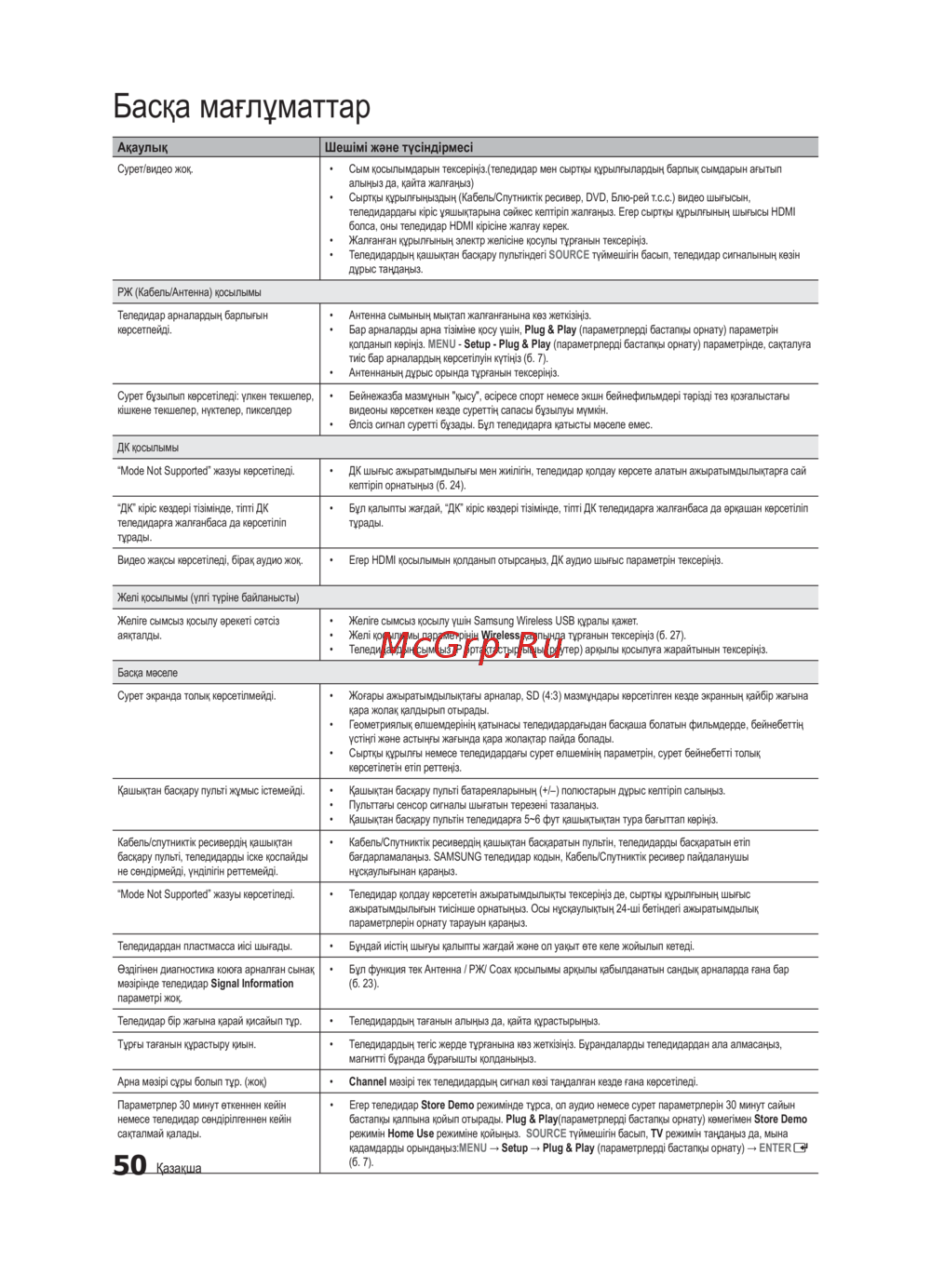 - Теледидарға қатысты қандай да бір сұрағыңыз болса алдымен осы тізімді қараңыз егер ақаулықты түзету үшін берілген кеңестердің біреуі де көмектеспесе www samsung com торабының қолдау көрсету бөліміне барыңыз немесе осы нұсқаулықтың артқы мұқабасында көрсетілген байланыс орталығына хабарласыңыз p.211