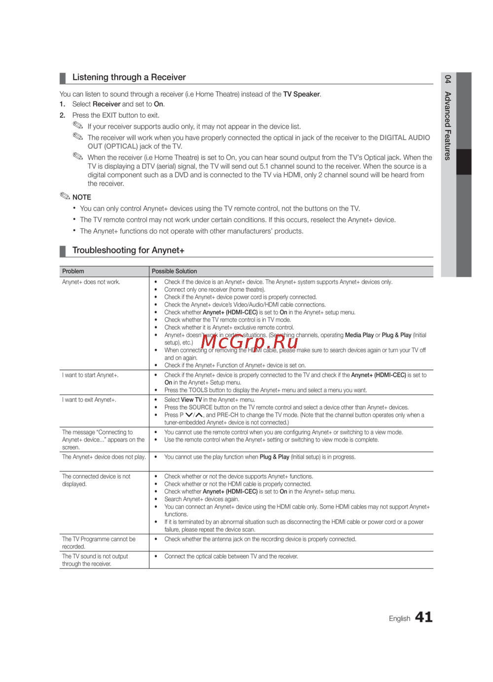 Anynet+ does not work. • Check if the device is an Anynet+ device. The Anynet+ system supports Anynet+ devices only.