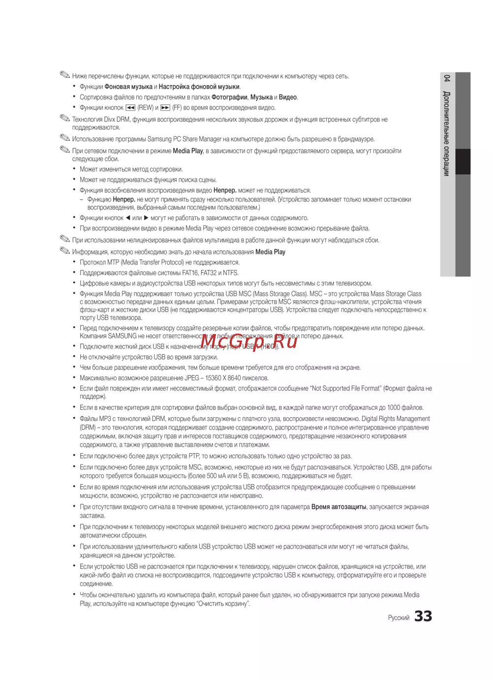 Компания SAMSUNG не несет ответственности за любые повреждения файлов и потерю данных.