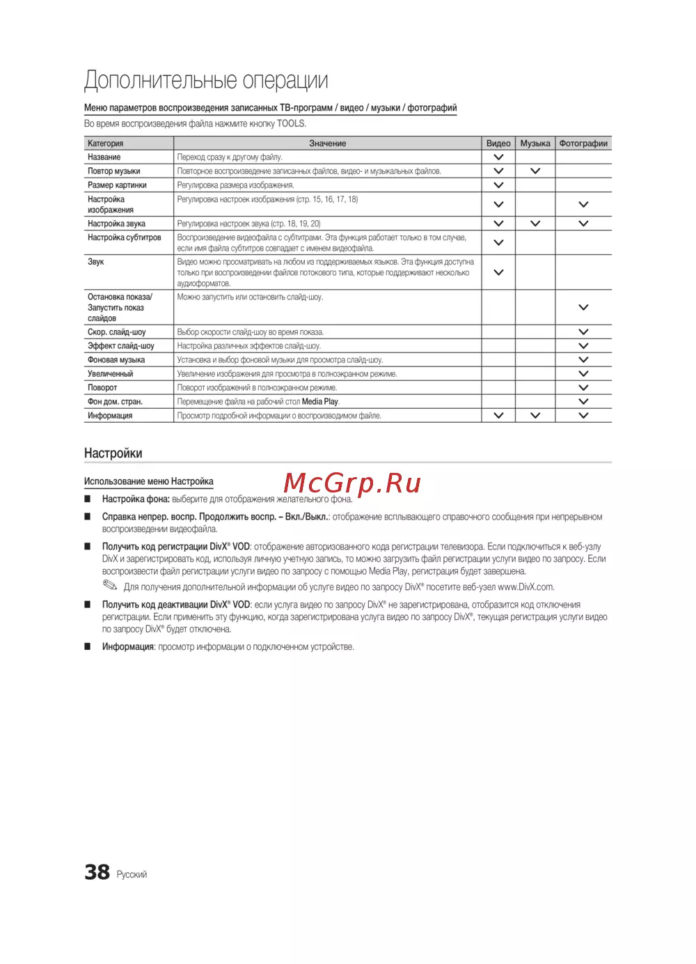 ■ Получить код регистрации DivX® VOD: отображение авторизованного кода регистрации телевизора. Если подключиться к веб-узлу